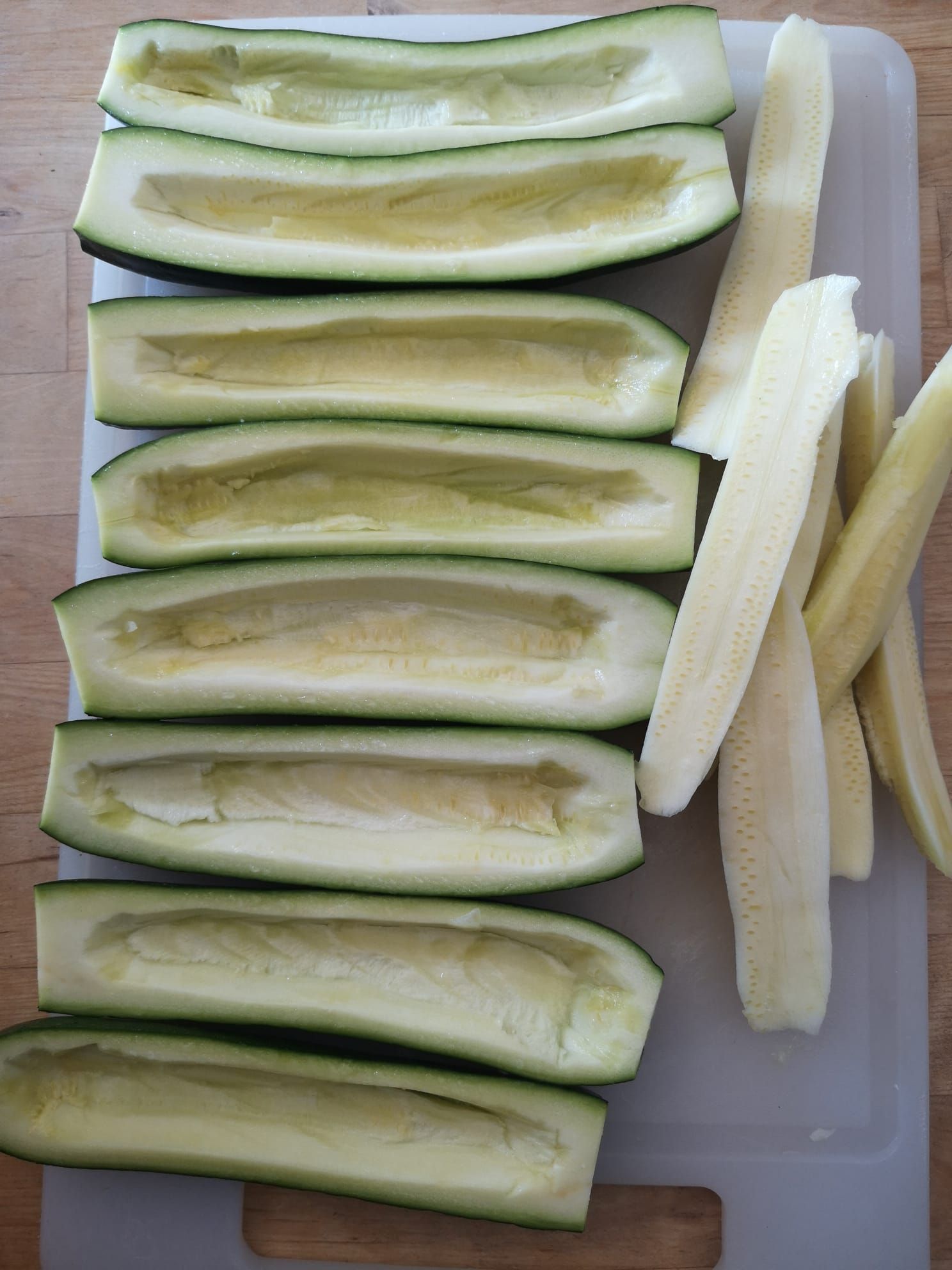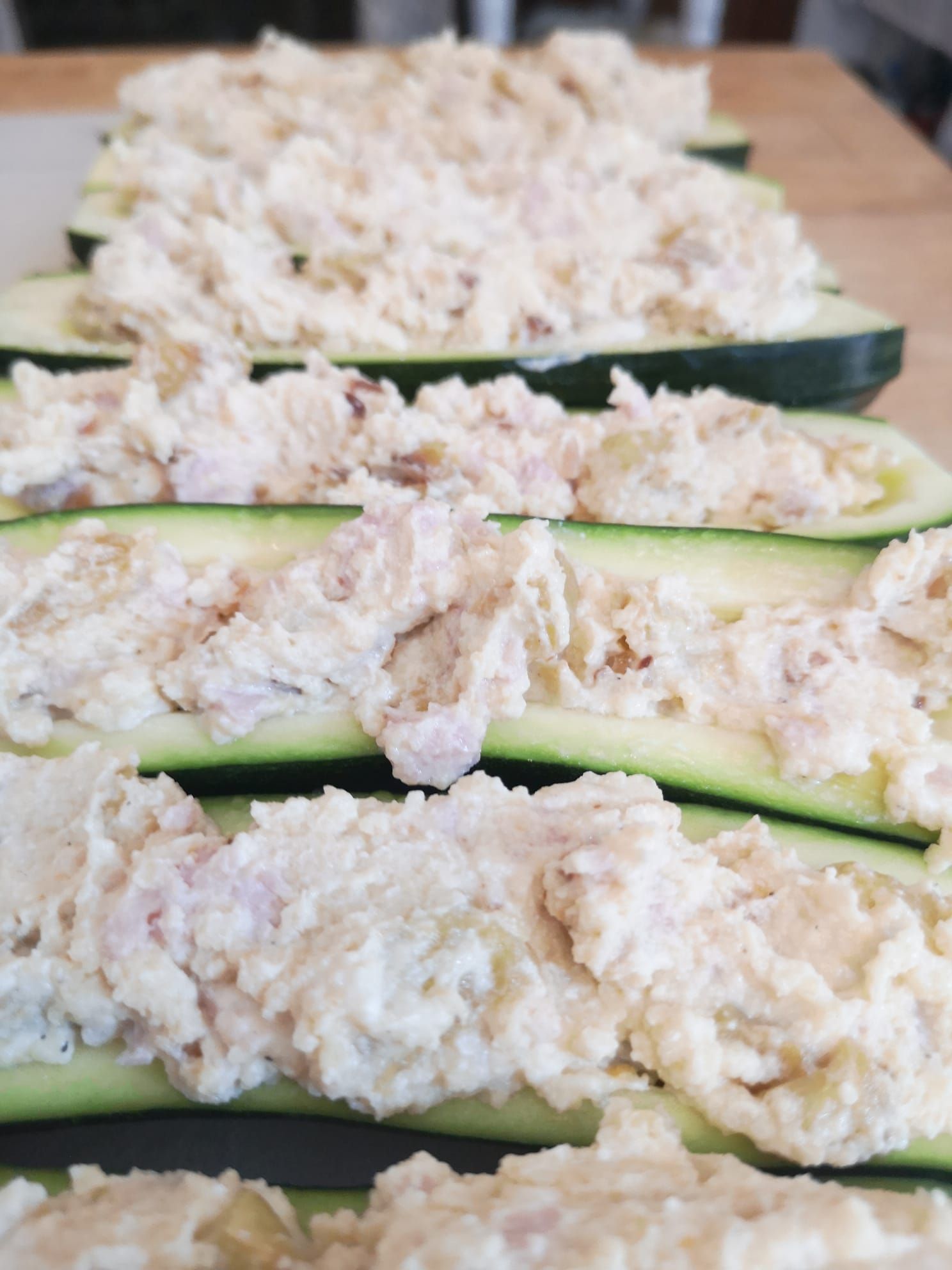 Now take the courgettes cut in half and fill them generously with the prepared filling.