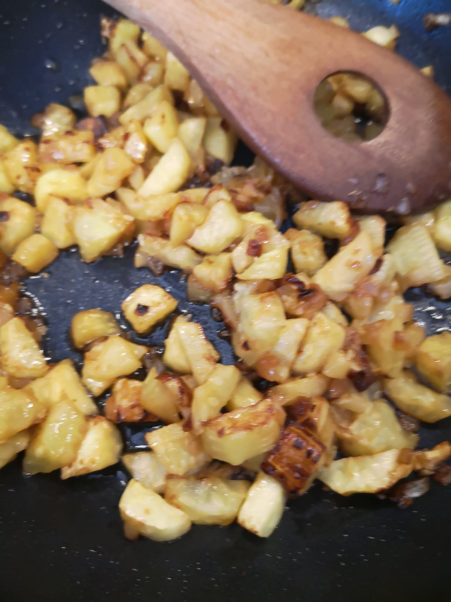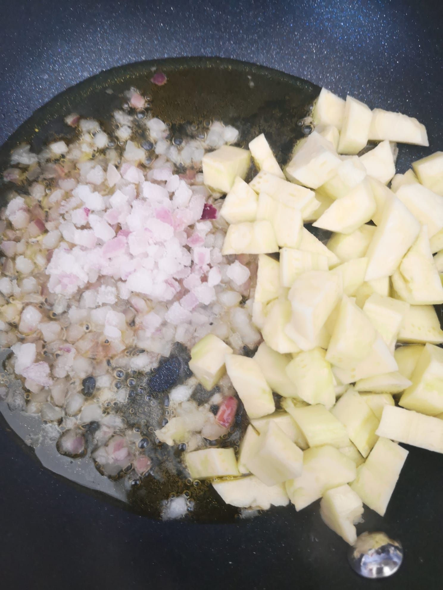 In una padella mettere un goccio d’olio e far cuocere lo scalogno tritato e la polpa delle zucchine a pezzetti; quindi lasciare raffreddare.