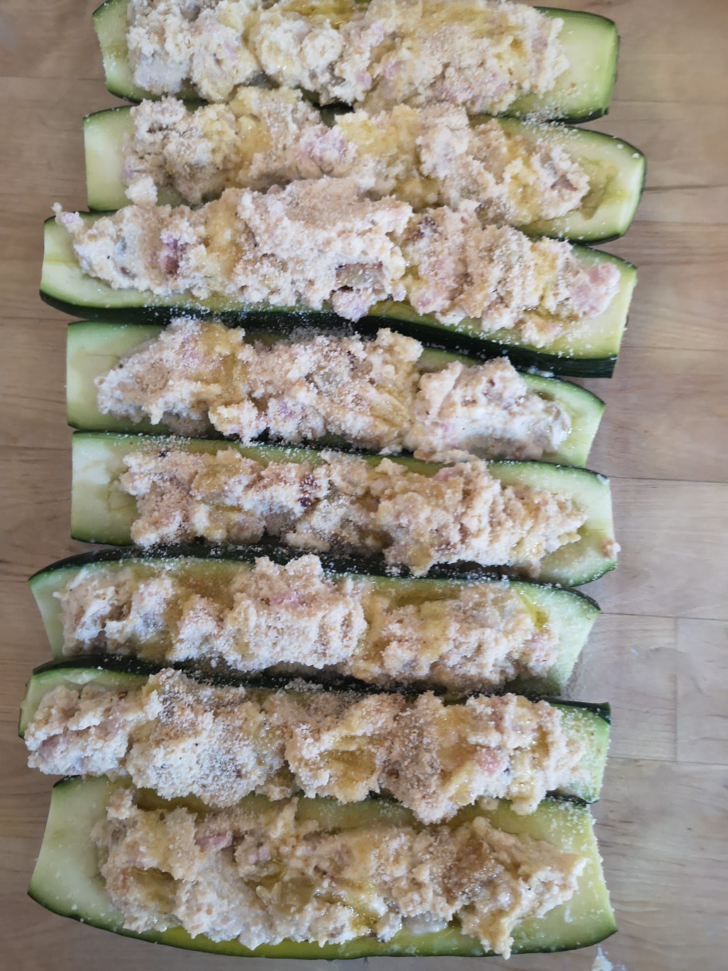 Ora prendere le zucchine tagliate a metà e riempirle abbondantemente con il ripieno preparato.
